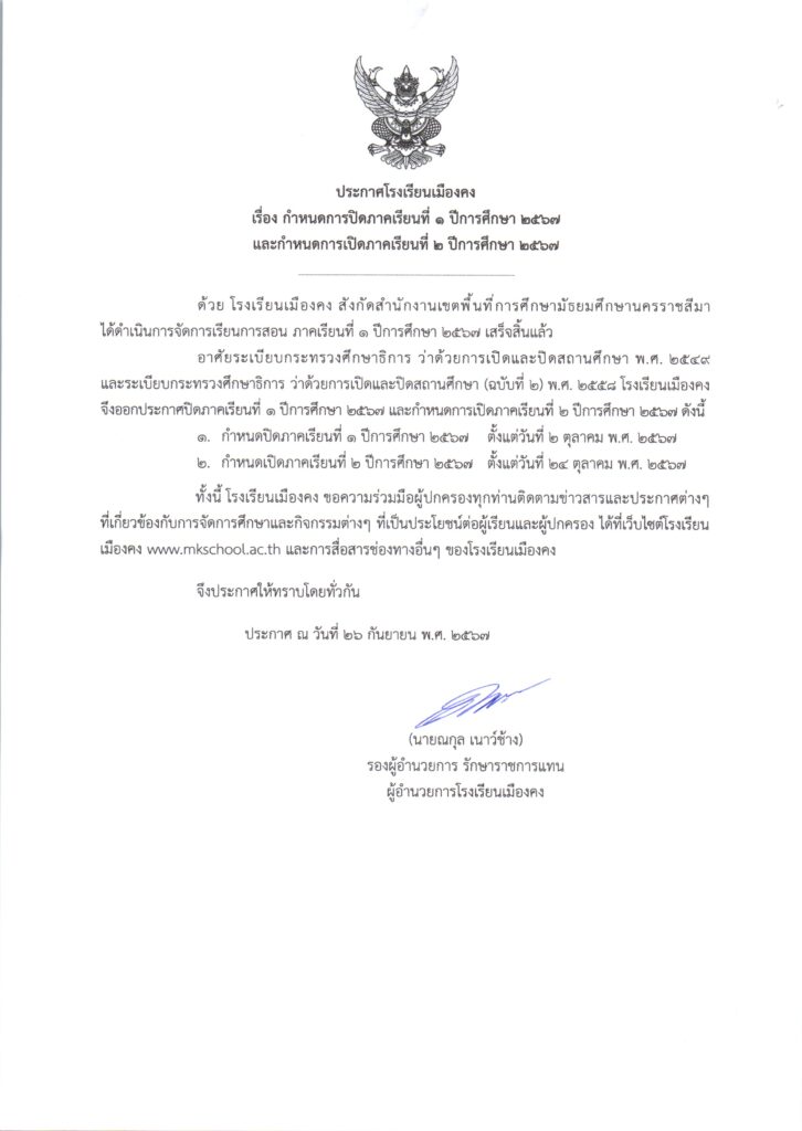 ประกาศโรงเรียนเมืองคง เรื่อง กำหนดการปิดภาคเรียนที่ ๑ ปีการศึกษา ๒๕๖๗ และกำหนดการเปิดภาคเรียนที่ ๒ ปีการศึกษา ๒๕๖๗ ตุลาคม 1, 2024ตุลาคม 2, 2024Admin Phiranan Prasoetsriข่าวประชาสัมพันธ์-โรงเรียนเมืองคง, ประกาศ